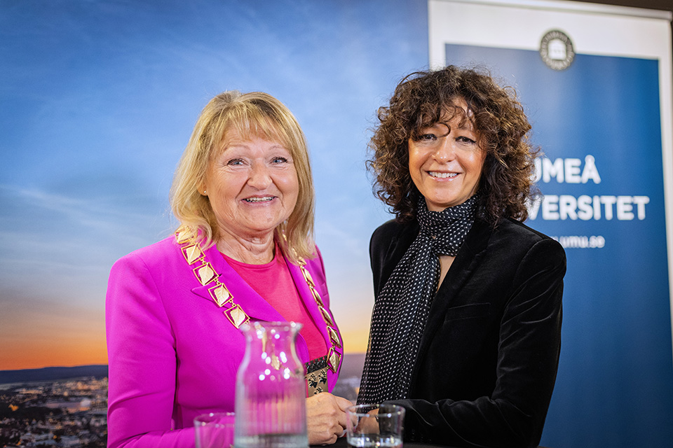 Professor Emmanuelle Charpentier och kommunfullmäktiges ordförande Marie-Louise Rönnmark under hedersmedborgarceremonin.