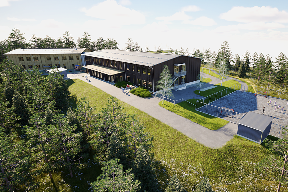 Den nya skolan och förskolans placering i förhållande till aktivitetshuset och den befintliga skolan. Illustration: Tyréns