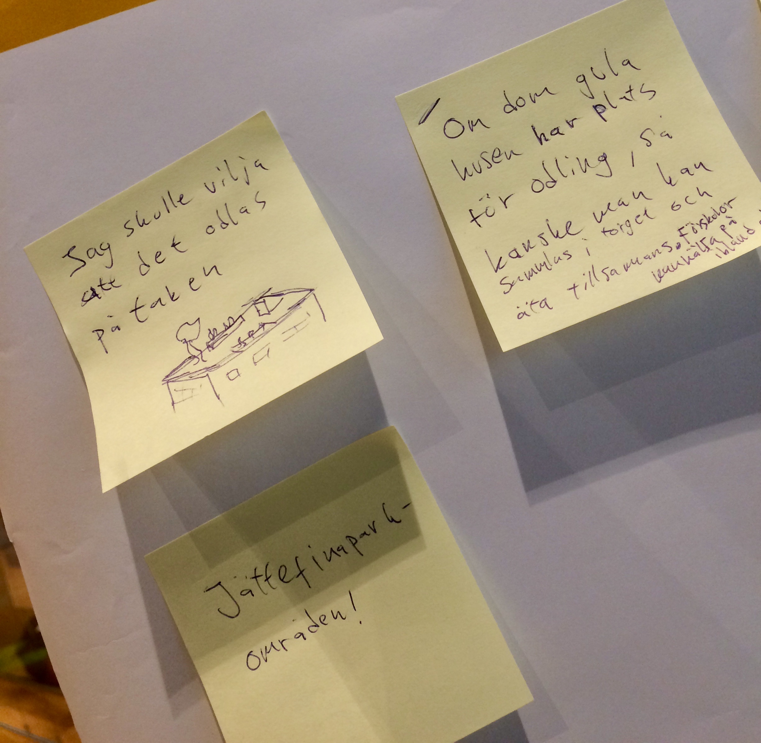 Foto av postitlappar uppsatta på kommentarsväggen. Bland annat "Fint med gång- alt cykelstråk in från gamla Tomteo och biltrafik runt.".Förstora bilden