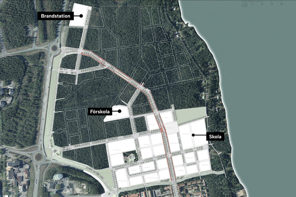 Tomtebo strand byggs i flera etapper. Bilden visar etapp 1 som omfattar cirka 900 bostäder, en brandstation, förskola, skola, torg, park, vård- och omsorgsboende samt kollektivtrafikens huvudstråk.