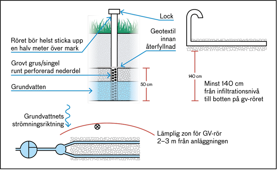 För infiltrationer och markbäddar krävs ett permanent grundvattenrör under anläggningens hela drifttid. Det gör det enklare för dig att kontrollera grundvattennivåerna och för oss att följa upp vid tillsyn.