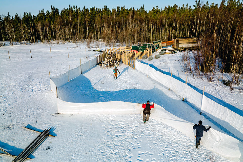 För att samla renarna använder renskötarna fyrhjulingar, motorcyklar, hundar och ibland även helikopter. Renägarna märker sina egna kalvar genom personliga snitt i örat för att de ska kunna kännas igen både i hage och på långt håll ute i naturen. Kalvmärkningen sker i stora hagar och då renen är ett arktiskt djur som inte trivs i värme sker samlingar och märkningar ofta på kvällar och nätter under sommaren.