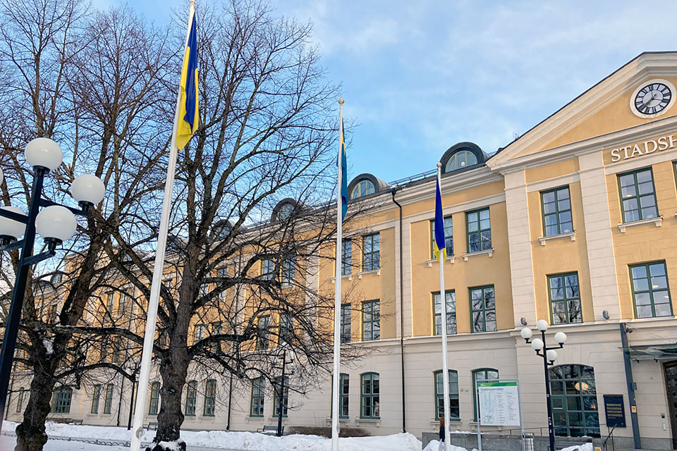 Ukrainas och Sveriges flagga hissades vid stadshuset i Umeå.