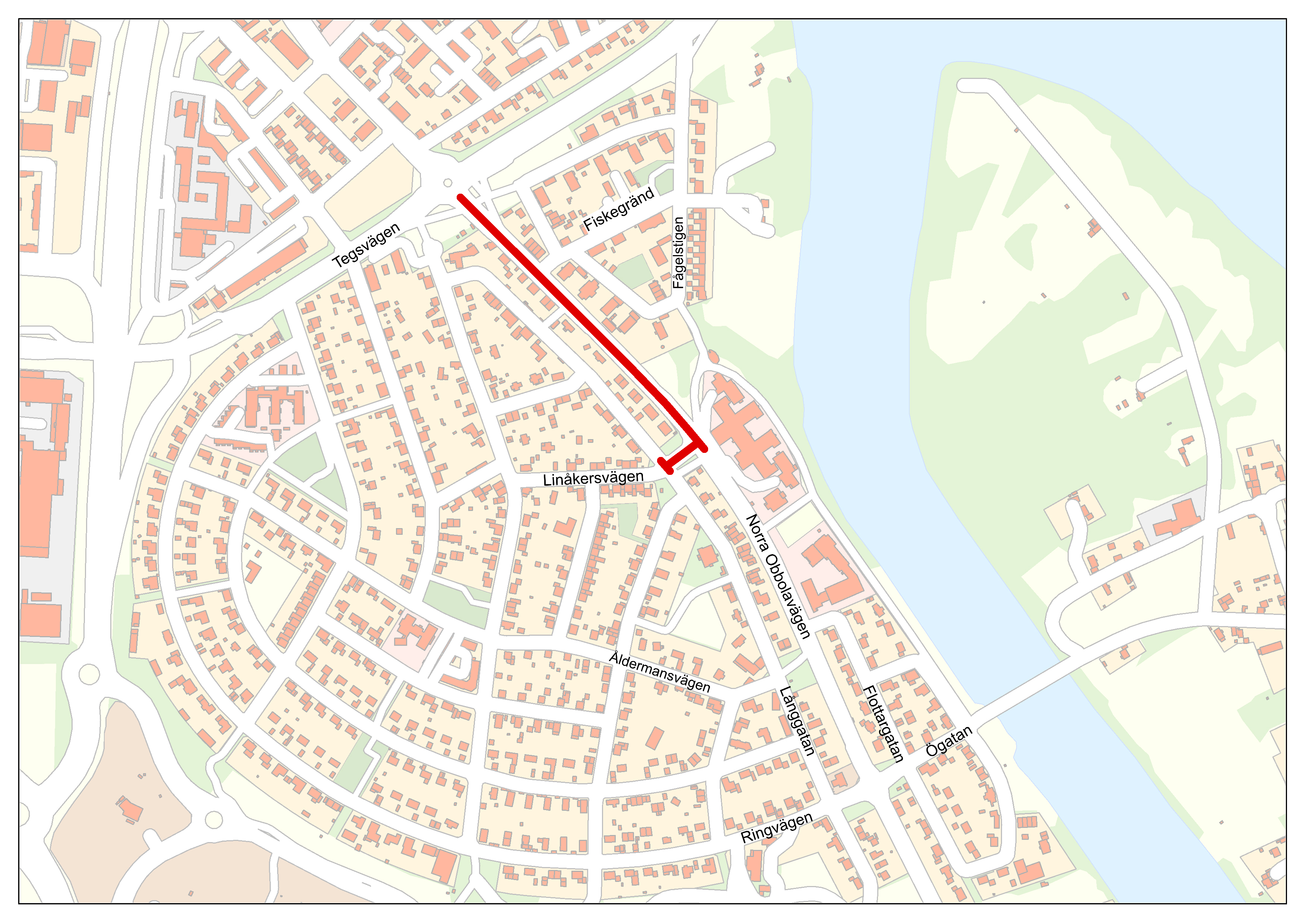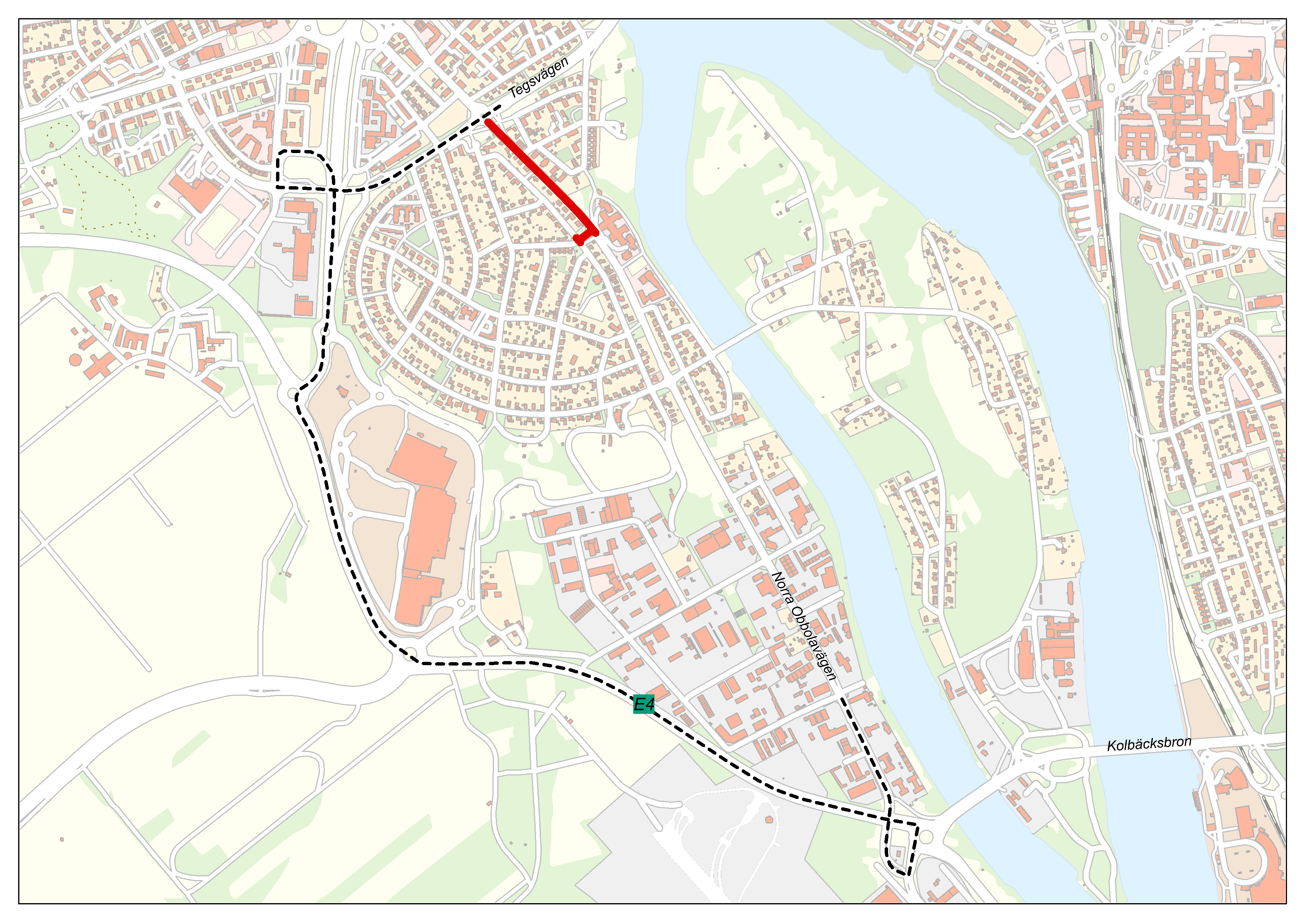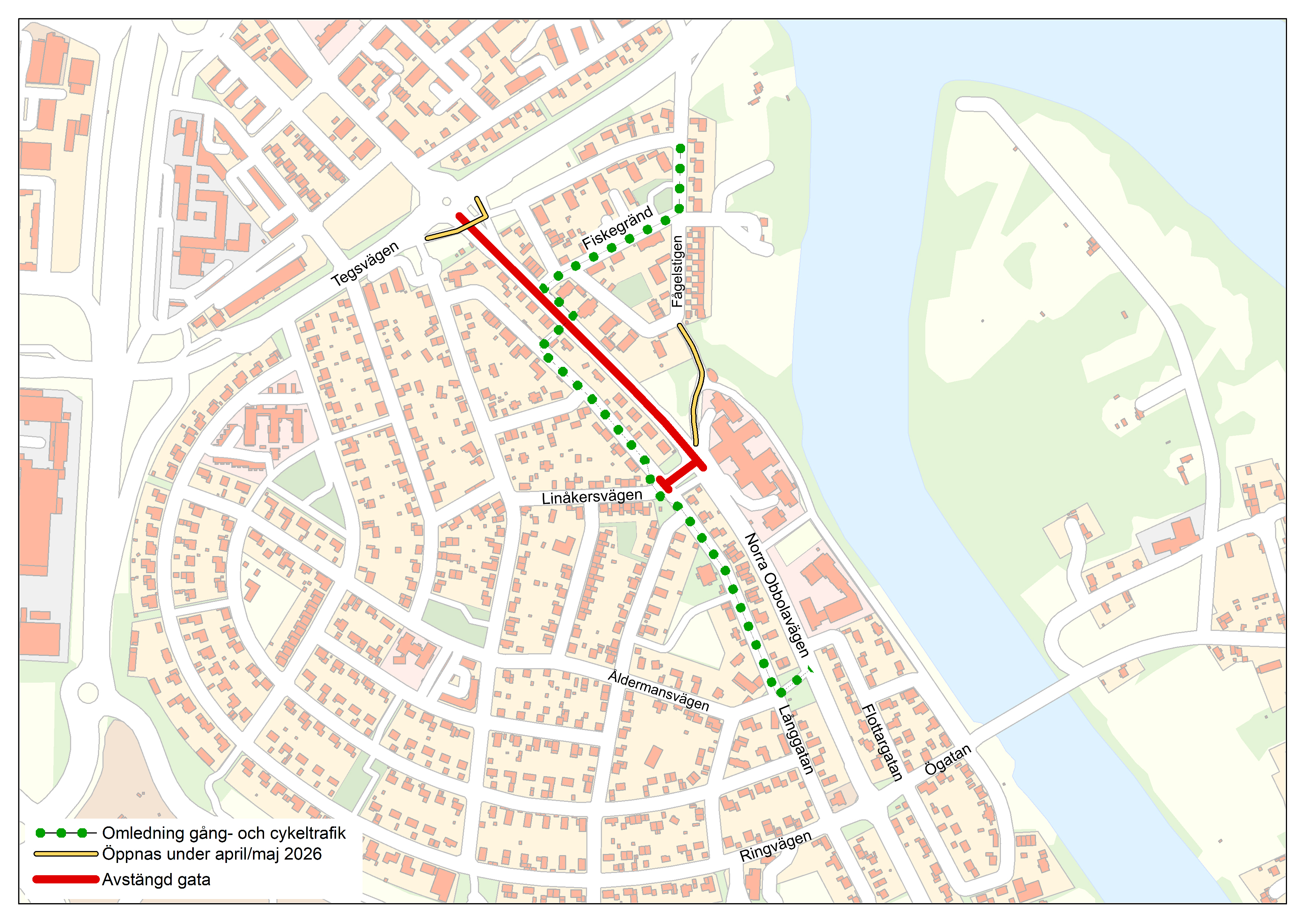 Cykeltrafik mellan Tegs centrum och skolan leds via Fågelstigen/Fiskegränd, över Norra Obbolavägen till Långgatan, tills dess att cykelportarna vid Tegsvägen samt gång- och cykelbanan mellan Norra Obbolavägen och Metargränd öppnas.