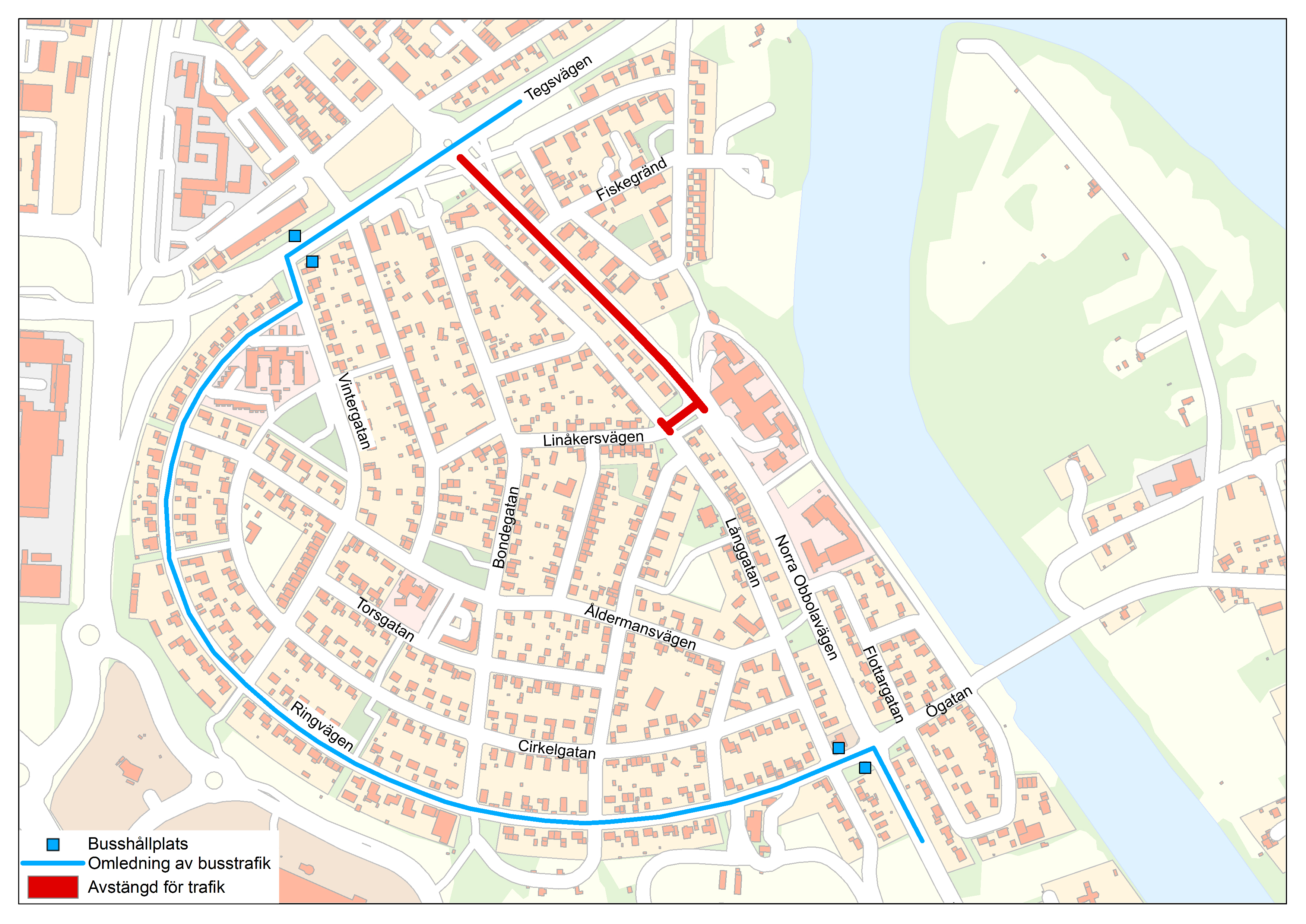 Bussar i linjetrafik leds om efter att vintertidtabellen gått ut från och med 4 maj 2026 och går då in på Söderslätt via Vintergatan och sedan Ringvägen ut till Norra Obbolavägen. Tillfälliga busshållplatser blir på Tegsvägen och i anslutning till korsningen Ringvägen/Norra Obbolavägen. Ett tillfälligt övergångsställe kommer anordnas vid övergången över Tegsvägen i höjd med Hökvägen. Omledningen av bussar gäller fram till att gatan kan öppnas för genomgående trafik hösten 2028.