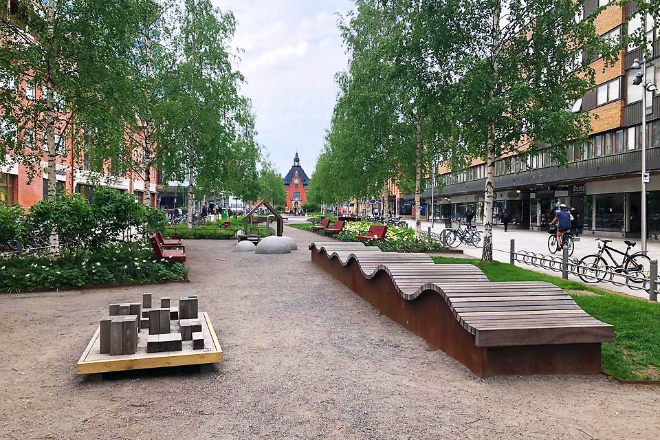 Rådhusesplanadens kulturhistoriska värde tillvaratogs i ombyggnationen, bland annat genom björkallén, med sitt ursprungliga utförande och mittstråkets öppna siktlinje för att synliggöra rådhuset och järnvägsstationen på håll. Men med ett nytt formspråk där grusytor och planteringsytor likt stora, kantiga isflak bildar stråk och platser och kraftiga stålkanter ramar in den gröna, blommande mittdelen.